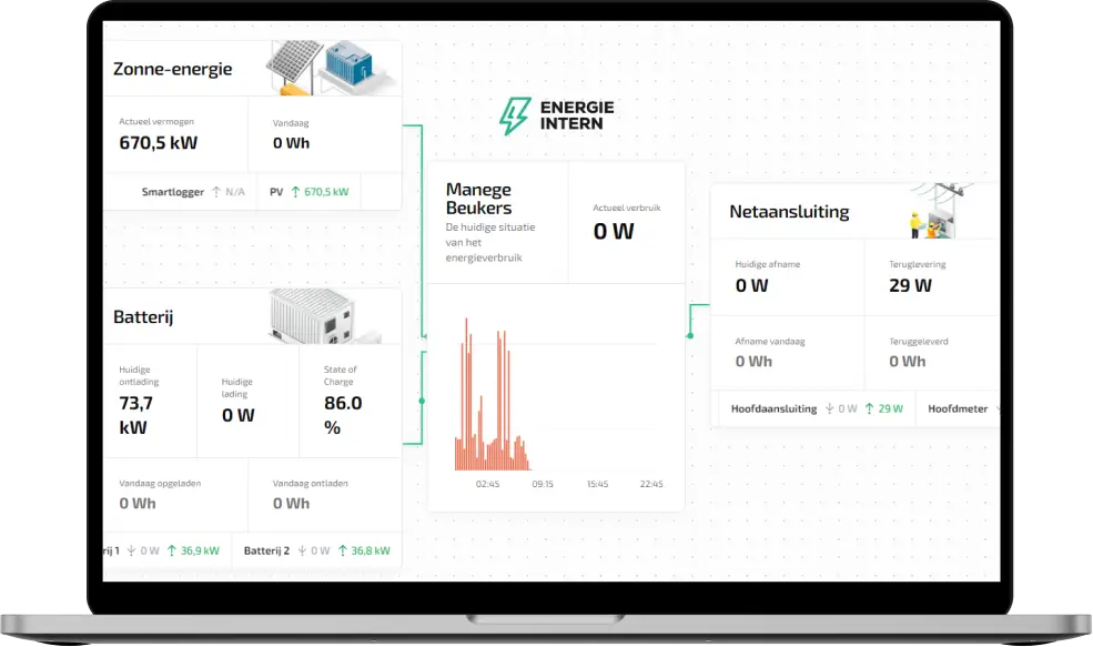Energie Intern helpt bedrijven met hun complete energie vraagstuk door op maat gemaakte oplossingen te bieden die voldoen aan specifieke eisen en wensen. We begeleiden klanten naar een duurzame toekomst door samen te werken met specialisten in slimme systemen en energiecontracten. Dit doen wij door middel van verschillende producten, zoals EOS, zonnepanelen, warmtepompen en bijvoorbeeld laadpalen met elkaar te laten praten door ons EMS systeem.